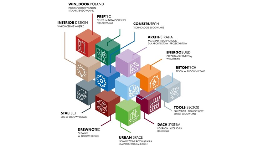 Okna, drzwi, bramy, fundamenty, ściany, stropy, posadzki, dachy, stal w budownictwie, materiały wykończeniowe, budownictwo energooszczędne, eko-budownictwo, maszyny, narzędzia, sprzęt pomocniczy, informatyka w budownictwie.